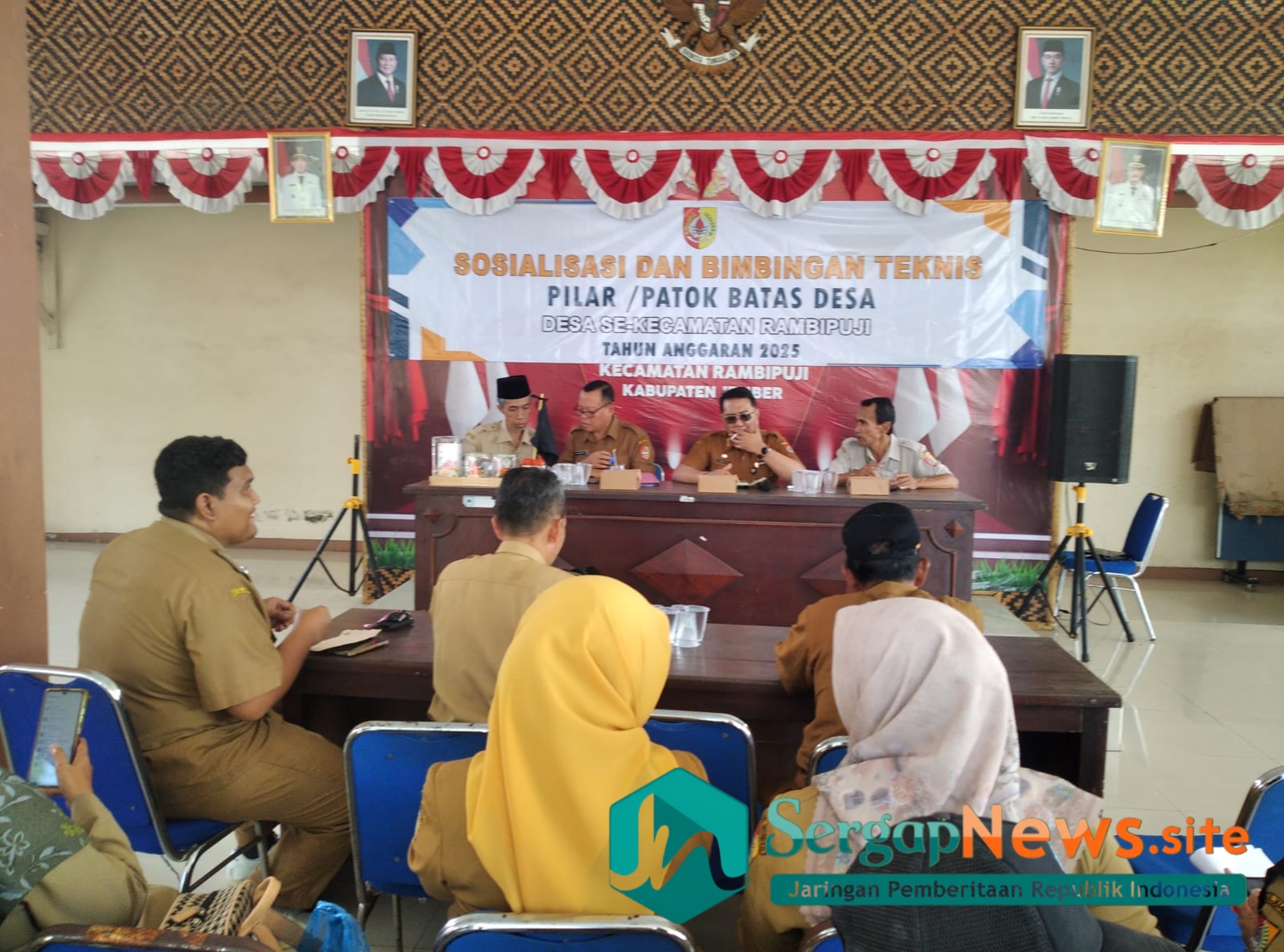 JEMBER, Sergap.news – Sosialisasi dan Bimbingan Teknis Pilar/Patok Desa se Kecamatan Rambipuji tahun anggaran 2025, dilaksanakan oleh Bapak Camat Rambipuji. Acara diadakan di aula kecamatan Rambipuji Jalan WR. Supratman No.70, Rambipuji, Kabupaten Jember.